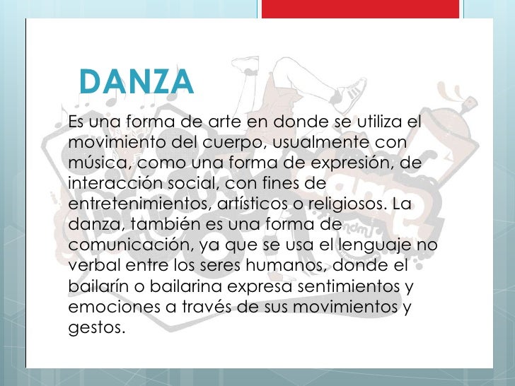 - 2. DANZAEs una forma de arte en donde se utiliza elmovimiento del cuerpo, usualmente conmúsica, como una forma de expresión, deinteracción social, con fines deentretenimientos, artísticos o religiosos. Ladanza, también es una forma decomunicación, ya que se usa el lenguaje noverbal entre los seres humanos, donde elbailarín o bailarina expresa sentimientos yemociones a través de sus movimientos ygestos.