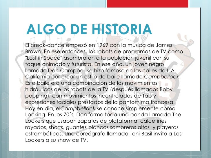 - 4. ALGO DE HISTORIAEl break-dance empezó en 1969 con la música de JamesBrown. En ese entonces, los robots de programas de TV como"Lost in Space" asombraron a la población juvenil con sutoque animado y futurista. En ese año, un joven negrollamado Don Campbell se hizo famoso en las calles de L.A.California por crear un estilo de baile llamado Campbellock.Este baile era una combinación de los movimientoshidráulicos de los robots de la TV (después llamados Bobypopping), con movimientos incontrolados de Tap yexpresiones faciales prestados de la pantomima francesa.Hoy en día, elCampbellock se conoce simplemente comoLocking. En los 70´s, Don formo toda una banda llamada TheLockers que usaban zapatos de plataforma, calcetinesrayados, shorts, guantes blancos sombreros altos y playerasestrambóticas. Una coreógrafa llamada Toni Basil invito a LosLockers a su show de TV.