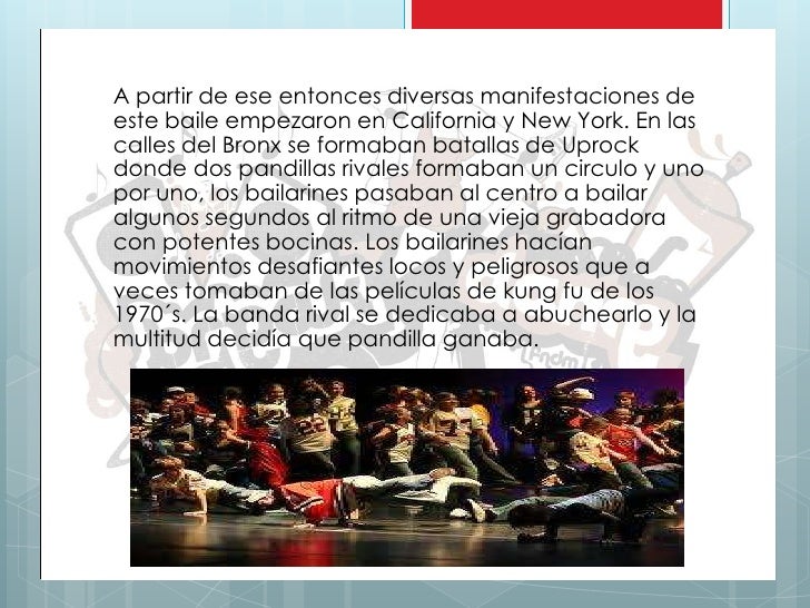 - 5. A partir de ese entonces diversas manifestaciones deeste baile empezaron en California y New York. En lascalles del Bronx se formaban batallas de Uprockdonde dos pandillas rivales formaban un circulo y unopor uno, los bailarines pasaban al centro a bailaralgunos segundos al ritmo de una vieja grabadoracon potentes bocinas. Los bailarines hacíanmovimientos desafiantes locos y peligrosos que aveces tomaban de las películas de kung fu de los1970´s. La banda rival se dedicaba a abuchearlo y lamultitud decidía que pandilla ganaba.