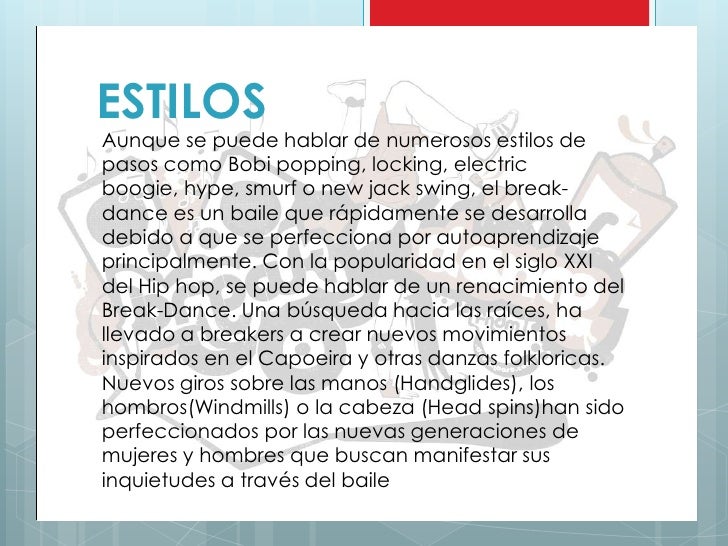 - 6. ESTILOSAunque se puede hablar de numerosos estilos depasos como Bobi popping, locking, electricboogie, hype, smurf o new jack swing, el break-dance es un baile que rápidamente se desarrolladebido a que se perfecciona por autoaprendizajeprincipalmente. Con la popularidad en el siglo XXIdel Hip hop, se puede hablar de un renacimiento delBreak-Dance. Una búsqueda hacia las raíces, hallevado a breakers a crear nuevos movimientosinspirados en el Capoeira y otras danzas folkloricas.Nuevos giros sobre las manos (Handglides), loshombros(Windmills) o la cabeza (Head spins)han sidoperfeccionados por las nuevas generaciones demujeres y hombres que buscan manifestar susinquietudes a través del baile