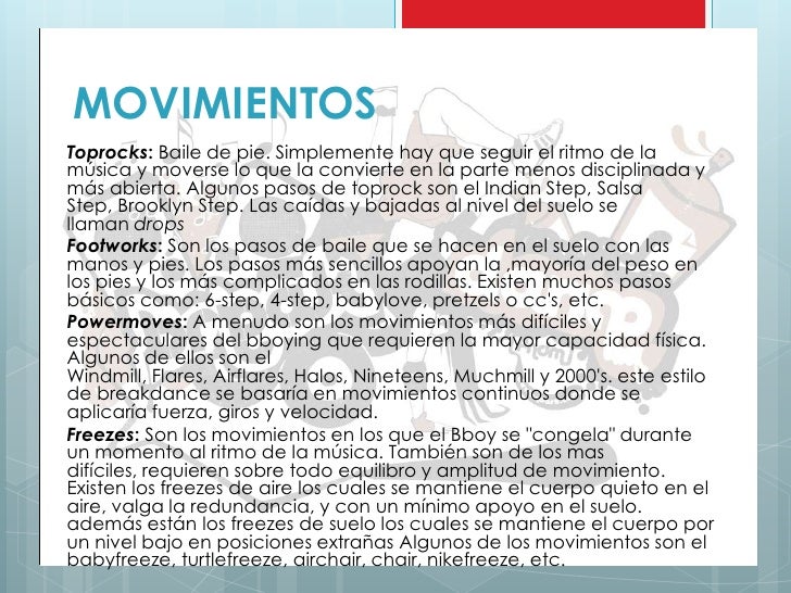 - 7. MOVIMIENTOSToprocks: Baile de pie. Simplemente hay que seguir el ritmo de lamúsica y moverse lo que la convierte en la parte menos disciplinada ymás abierta. Algunos pasos de toprock son el Indian Step, SalsaStep, Brooklyn Step. Las caídas y bajadas al nivel del suelo sellaman dropsFootworks: Son los pasos de baile que se hacen en el suelo con lasmanos y pies. Los pasos más sencillos apoyan la ,mayoría del peso enlos pies y los más complicados en las rodillas. Existen muchos pasosbásicos como: 6-step, 4-step, babylove, pretzels o ccs, etc.Powermoves: A menudo son los movimientos más difíciles yespectaculares del bboying que requieren la mayor capacidad física.Algunos de ellos son elWindmill, Flares, Airflares, Halos, Nineteens, Muchmill y 2000s. este estilode breakdance se basaría en movimientos continuos donde seaplicaría fuerza, giros y velocidad.Freezes: Son los movimientos en los que el Bboy se "congela" duranteun momento al ritmo de la música. También son de los masdifíciles, requieren sobre todo equilibro y amplitud de movimiento.Existen los freezes de aire los cuales se mantiene el cuerpo quieto en elaire, valga la redundancia, y con un mínimo apoyo en el suelo.además están los freezes de suelo los cuales se mantiene el cuerpo porun nivel bajo en posiciones extrañas Algunos de los movimientos son elbabyfreeze, turtlefreeze, airchair, chair, nikefreeze, etc.
